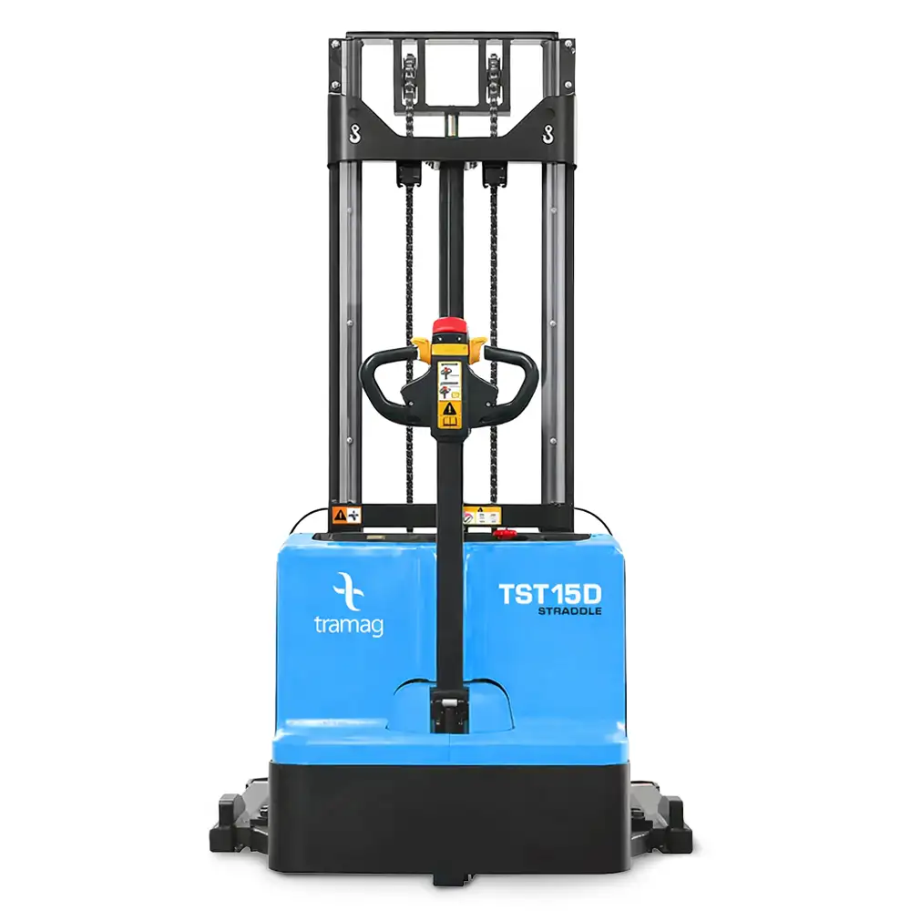 De Tramag TST15D elektrische breedspoor stapelaar is een stabiele en veelzijdige meeloopstapelaar met een hefvermogen van 1500 kg en een maximale hefhoogte tot 4000 mm. Dankzij de breedspooruitvoering met verstelbare steunpoten en vorkenbord is deze stapelaar bijzonder geschikt voor het heffen van bredere pallets, blokpallets en andere afwijkende ladingen.