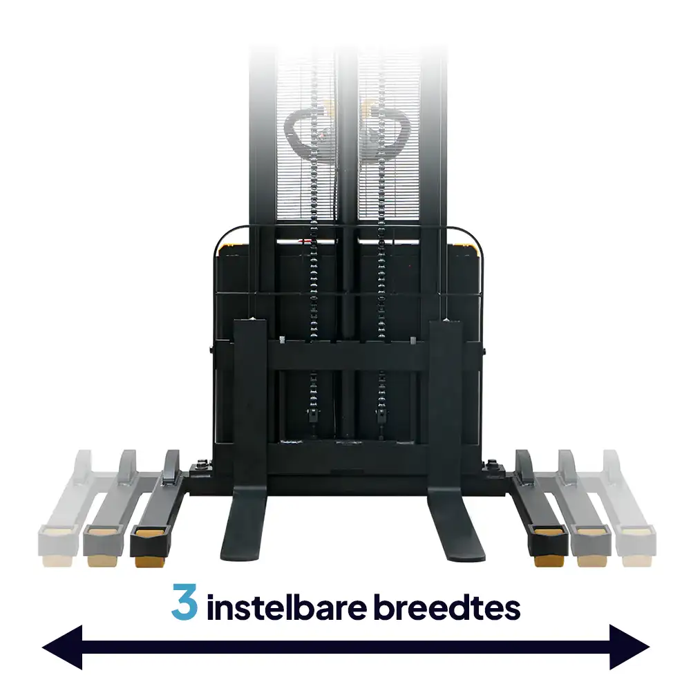 Dankzij de steunpoten met 3 instelbare breedtes kan de stapelaar eenvoudig worden aangepast aan verschillende palletformaten en werksituaties.