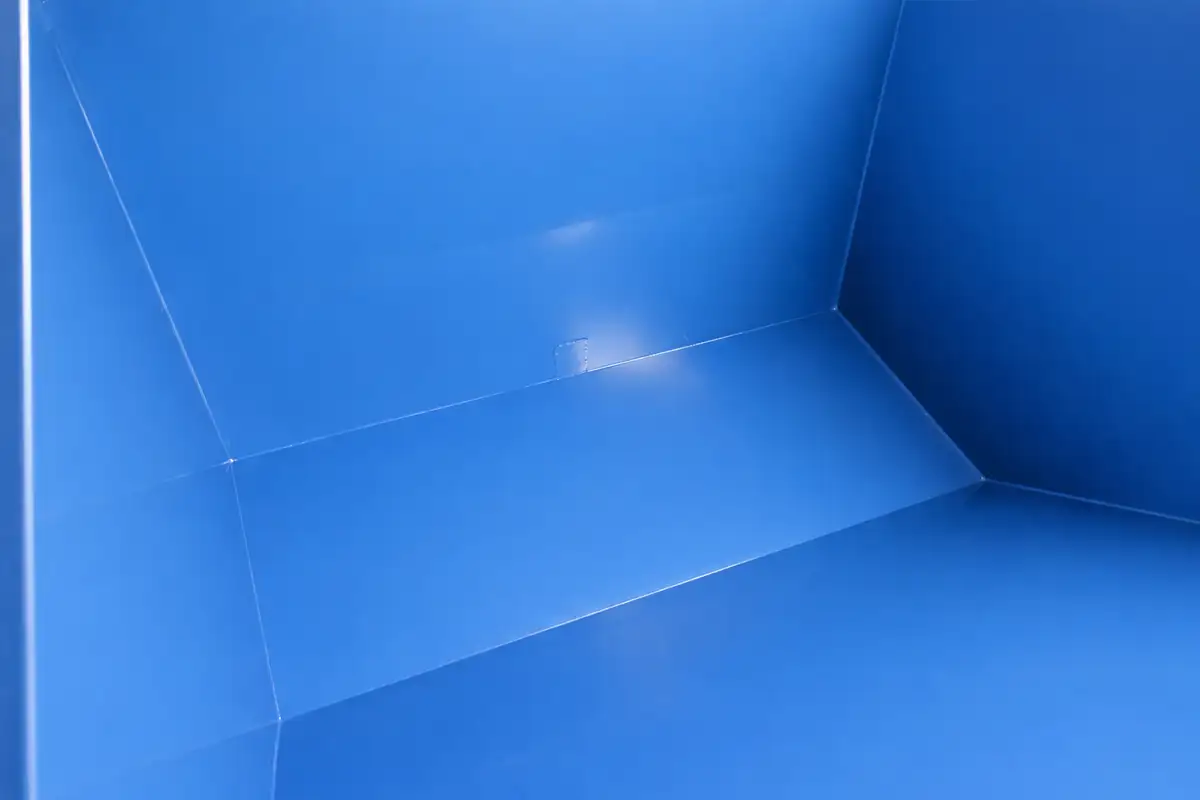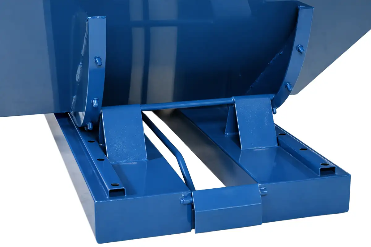 De kiepbak is voorzien van een staaldikte van 2 mm, wat ruimschoots voldoende is om de maximale capaciteit van 1000 tot 1500 kg te dragen. Zowel de bak als het onderstel zijn behandeld met een duurzame coating, die is aangebracht in de standaardkleur blauw (RAL5019). Hierdoor is de kiepbak beter beschermd tegen zaken als corrosie.