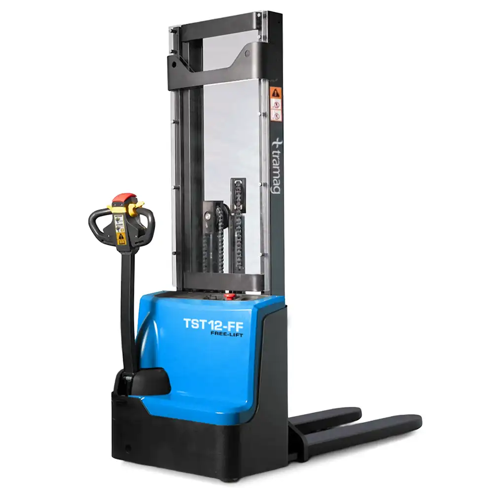 De TST12-FF is een instapmodel elektrische stapelaar met vrije heffing en daarmee ideaal om te gebruiken in ruimtes met beperkte doorrijhoogte. Met deze meeloopstapelaar kunt u eenvoudig lasten tot 1200 kg verplaatsen. Dankzij de vrije heffing (free lift) kunt u de vorken heffen waarbij de bovenkant van de mast niet meteen uitschuift.