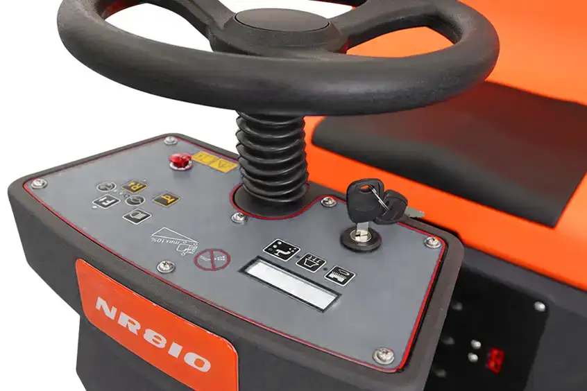 De NR810 zit-schrobmachine is ontworpen voor eenvoudig en veilig gebruik. Dankzij het waterbestendige bedieningspaneel met LCD-display zijn alle functies intuïtief te bedienen. Met één druk op de knop activeert u het watersysteem en de vacuümfunctie.